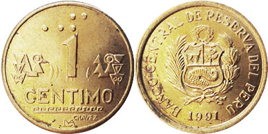 1 CENTIMO / CHAVEZ / LIMA monograma / Braille, ornamento inca