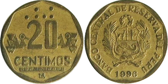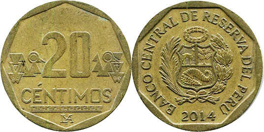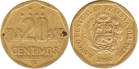 20 CENTIMOS / CHAVEZ / LIMA monograma / Braille, ornamento inca