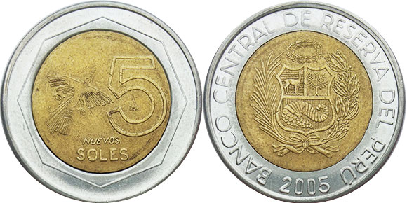 5 nuevos soles 1994-2009bimetálico - latão/aço inoxidável