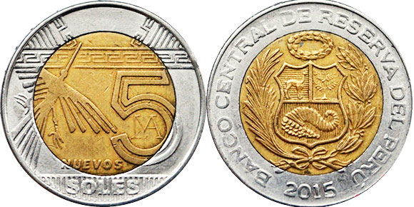 5 nuevos soles 2010-2015bimetálico - latão/aço inoxidável